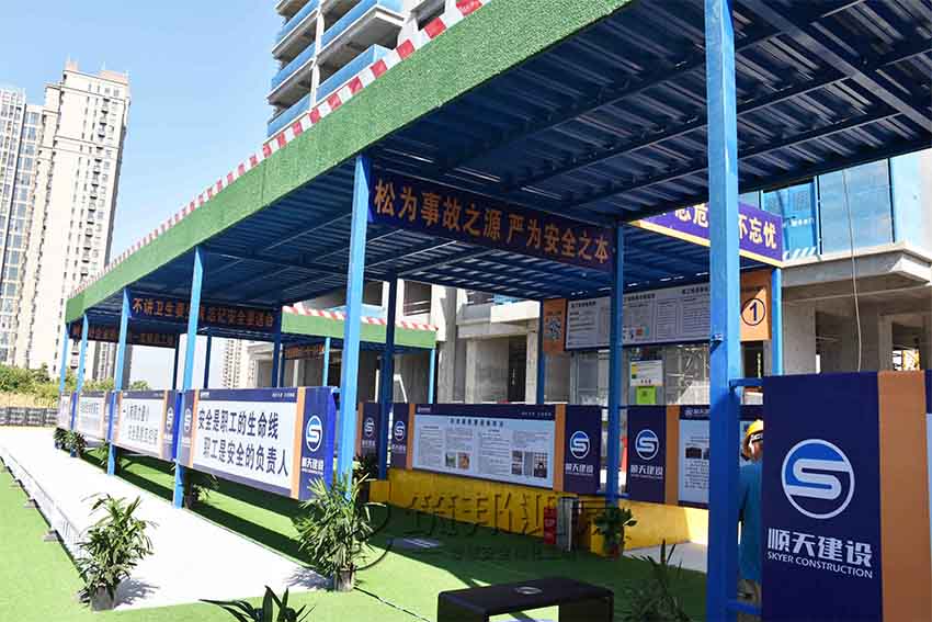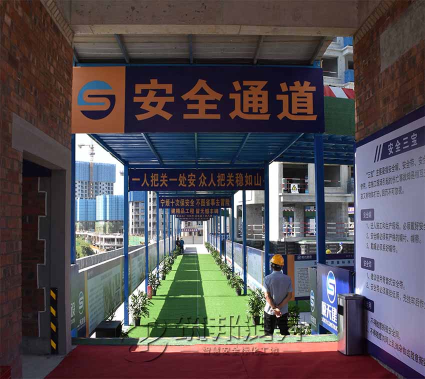 安全通道,施工現場實行人車分流,主要人員出入通道搭設了專用安全通道,安全通道兩側設置宣傳欄,提升施工作業人員的質量意識、安全意識。